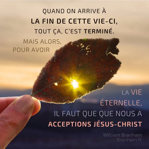 Or, quelle erreur fatale, de rejeter la conduite qui mène à la Vie Éternelle, parce que, voyez-vous, ça, c’est une Vie qui ne pourra jamais avoir de fin. Bon, l’instruction, c’est bien, ça va nous aider ici-bas. Les affaires, c’est bien. L’argent, c’est bien. Être un bon garçon et une bonne fille, c’est bien. Mais, voyez-vous, quand on arrive à la fin de cette vie-ci, tout ça, c’est terminé. Vous comprenez? Vous les adultes, vous comprenez? [L’assemblée dit : “Amen.”–N.D.É.] Voyez? Tout ça, c’est terminé. Mais alors, pour avoir la Vie Éternelle, il faut que nous acceptions Jésus-Christ. Il n’y a que Jésus qui peut vous conduire à Elle.